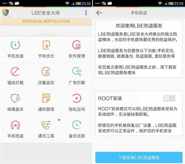 在主界面上滑动以打开全部功能菜单,找到“手机防盗”功能,然后单击进入. 如果您的手机已扎根,则可以选择ROOT安装模式. 在这种模式下,LBE防盗服务可以作为系统组件安装,并且不能轻易卸载.