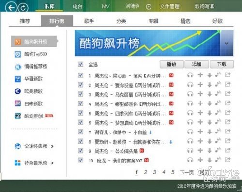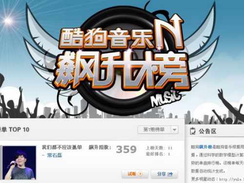 除及时更新来自全球的王牌榜单之外,酷狗音乐还依据自家服务器后台所采集的每日数亿酷狗用户的试听数据,通过严密的精准推算,发布每天实时更新的“酷狗音乐飙升榜”,第一时间反馈互联网用户关注和试听音乐的动向和热度。例如刚刚发行新专辑《十二新作》的周董周杰伦,专辑刚刚上线一天就凭借超高的点击试听量冲上了飙升榜,有7首新歌称霸当日的飙升榜Top 10。