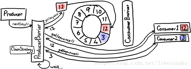 2.为了让队列安全的在多线程环境运行,需要整个队列上锁,带来的开销是巨大的。来看ringbuffer是如何无锁的(简化起见,讨论一个生产者一个消费者的情况)。为了解释这个原理,这里借用别人的图来阐述这个问题。比如目前有一个consumer,停留在位置12,这时producer假设在位置3,这时producer的下一步是如何处理的呢?producer会尝试读取4,发现没有到下一个consumer,所以可以安全获取,于是将之改为14,并且将产品publish到14,并且通知一个阻塞的consumer起来活动。如此一直到11都是安全的(这里我们假设生产者比较快),当producer尝试访问12时发现不能继续,于是交出控制权;而consumer开始移动时,会调用barrier的waitFor方法,waitFor看到前面最近的安全节点已经到了20(21是producer),于是直接返回20,所以现在consumer可以无锁的去消费13到20的所有产品,可以想象,这种方式比起synchronized要快上很多倍。