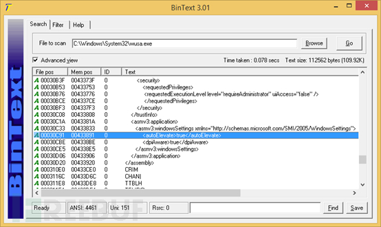 另外一种可用于复制文件到安全位置的方法是使用Windows 更新独立安装程序 (wusa.exe)。Wusa.exe执行时作为高级别完整性进程运行就如同在其清单中设置了自动提升一样。对于自动进行 UAC提升的Windows 可执行文件,必须是被签名过的文件,并位于如 C:\Windows\System32 的安全目录中,并且必须在其清单中指定的自动提升属性。
