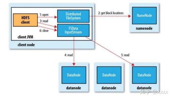 2. 文件读取过程: HDFS Cline客户端首先打开DFS系统,然后从NN获取块复制位置列表的一部分. 然后获得该块,最后合并为一个文件. 通过DataNode获取块时,采用了最近原则.
