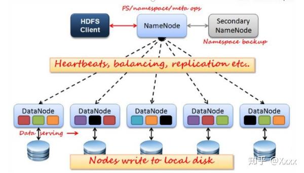 DateNode: 本地存储数据(块),文件格式,存储块元数据(md5值)信息文件. DateNode将块信息报告给NameNode. 通过发送心跳信号到NameNode保持联系,如果NameNode在10分钟内未收到DateNode. 如果心跳信号丢失,则认为它丢失了,并将原始DateNode上的块复制到其他DateNodes.