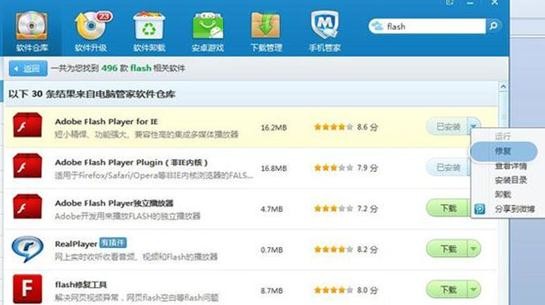 1. 打开【电脑管家】→点击【软件管理】,在搜索框中输入"flash"→找到相应版本点击【安装】或【升级】(如果以安装请点击下箭头后选择修复,如此步骤无法成功修复,可继续执行第二步骤再进行此步骤)