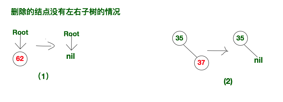 删除的结点没有左子树也没有右子树,也就是删除的结点为叶子结点。这种情况下我们有可以细分为两类,一种是该叶子结点就是二叉排序树的根节点,也就是二叉排序树中只有一个节点的情况。只需要将root指针置为空即可。再一种情况是有删除的叶子节点有父节点,直接将父节点连接该删除节点的指针置空即可。如下所示: