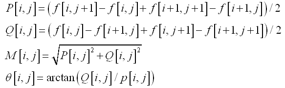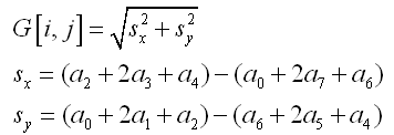 上式为其x和y方向偏导数计算模板,可用数学公式表达其每个点的梯度幅值为: