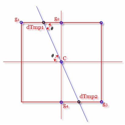 但实际上,我们只能得到C点邻域的8个点的值,而dTmp1和dTmp2并不在其中,要得到这两个值就需要对该两个点两端的已知灰度进行线性插值,也即根据图1中的g1和g2对dTmp1进行插值,根据g3和g4对dTmp2进行插值,这要用到其梯度方向,这是上文Canny算法中要求解梯度方向矩阵Thita的原因。