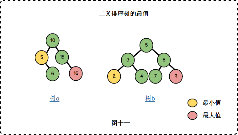 二叉排序树的最小值位于其最左节点上;最大值位于其最右节点上: