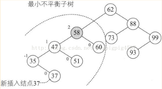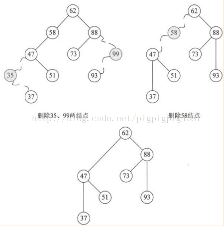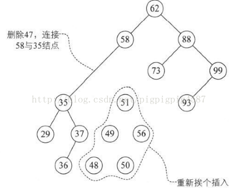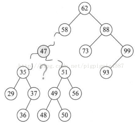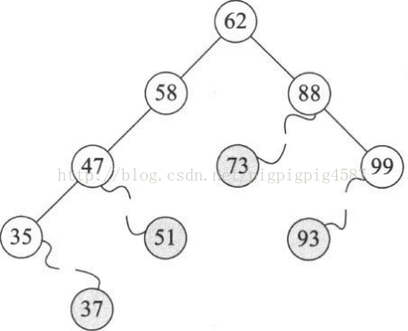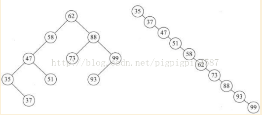 {62,88,58,47,35,73,51,99,37,93}这样的数组,我可以表示为上图左图的二叉排序树。