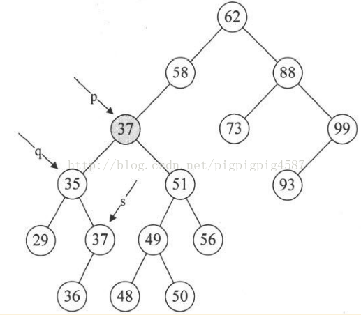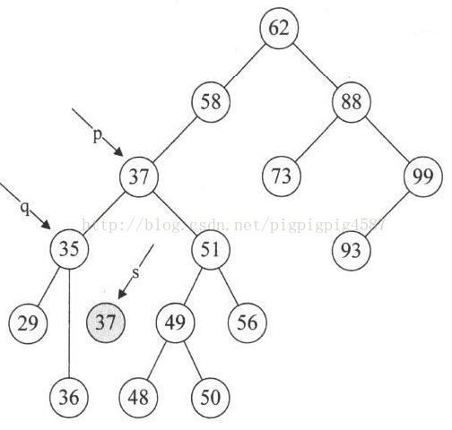 5.第15~18行,循环找到左子树的右结点,直到右侧尽头。就当前例子来说,就让q指向35,而s指向37这个没有右子树的结点,如图
