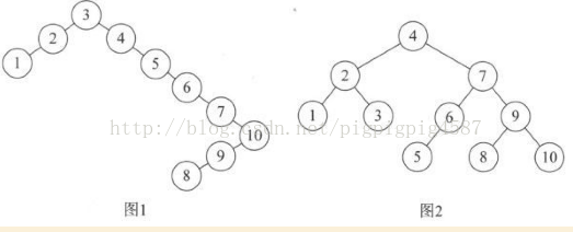 {35,37,47,51,58,62,73,88,93,99},则二叉排序树就成了极端的右斜树,注意它依然是一棵二叉排序树,如上图右。同样去找99。左图比较两次,右图要比较10次。二者差异很大的