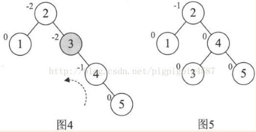 增加结点5时,结点3的BF为-2说明要旋转了。由于BF是负,所以我们对这棵最小不平衡子树进行左旋(逆时针旋转)图4