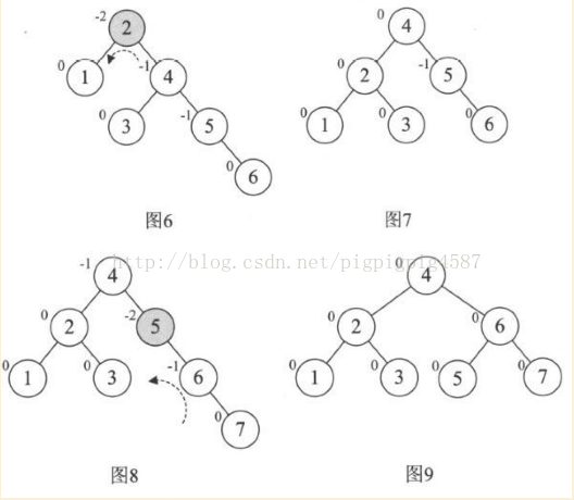 接着插入8,情况与赐教类,结点6的BF是-2,而它的右孩子9的BF是1,因此首先以9为根结点,进行右旋,得到图15.此时结点6,7的符号都是负的,再以结点6为根结点左旋,最终得到最后的平衡二叉树,如图