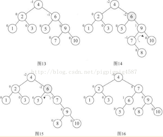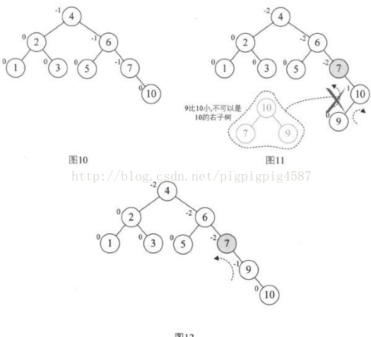 不统一,就将其统一。于是我们对结点9和结点10进行右旋,使得结点10成为9的右子树,结点9的BF为-1,此时就与结点7的BF符号统一了,如图12