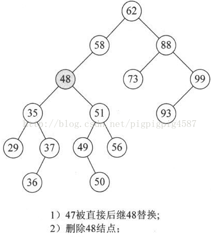 我们仔细观察一下,47的两个子树中能否找出一个结点可以代替47呢?果然有,37或者48都可以代替47,此时在删除47后,整个二叉排序树并没有必生本质的改变。