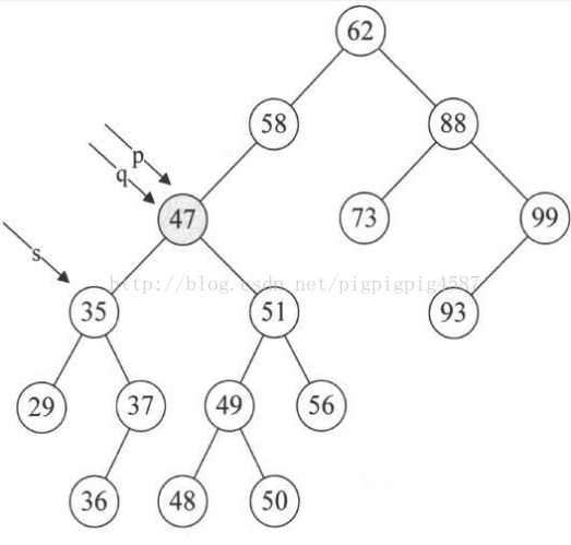 4.第14行,将要删除的结点p赋给临时的变量q,再将p的左孩子p->lchild赋给临时的变量s。此时q指向47结点,s指向35结点。如图