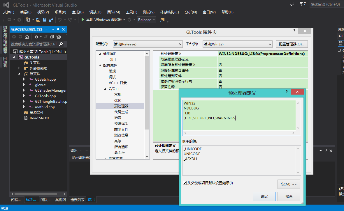 这个是比较难配置的一个包,需要如同在VS2012配置环境一样需要自行编译,GLTools我放在工具包里,然后在VS2013中建立一个win32静态库工程工程名GLTools,建立的时候去掉预编译头,然后首先将GLTools中的include文件夹全部覆盖到vs目录中的vc/include中(切记哦,不然可能导致无法编译),将GLTools/src中的文件添加到工程中,同时在项目》属性》C/C》预处理器》预处理器定义 中添加_CRT_SECURE_NO_WARNINGS项