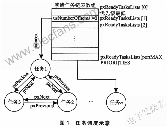 实现多个任务的有效管理是操作系统的主要功能。FreeRTOS下可实现创建任务、删除任务、挂起任务、恢复任务、设定任务优先级、获得任务相关信息等功能。下面主要讨论FreeRTOS下任务创建和任务删除的实现。当调用sTaskCreate()函数创建一个新的任务时,FreeRTOS首先为新任务分配所需的内存。若内存分配成功,则初始化任务控制块的任务名称、堆栈深度和任务优先级,然后根据堆栈的增长方向初始化任务控制块的堆栈。接着,FreeRTOS把当前创建的任务加入到就绪任务链表。若当前此任务的优先级为最高,则把此优先级赋值给变量ucTopReadyPriorlty(其作用见2.1节)。若任务调度程序已经运行且当前创建的任务优先级为最高,则进行任务切换。