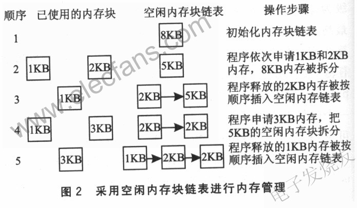下面以图2为例介绍方法2的实现。假定用于动态分配的RAM共有8KB,系统首先初始化空闲内存块链表,把8KB RAM全部作为一个空闲内存块。当应用程序分别申请1KB和2KB内存后,空闲内存块的大小变为5KB3。2KB的内存使用完毕后,系统需要把2KB插入到现有的空闲内存块链表。由于2 KB<5KB,所以把这2 KB插入5KB的内存块之前。若应用程序又需要申请3 KB的内存,而在空闲内存块链表中能满足申请内存要求的最小空闲内存块为5KB,因此把5KB内存拆分为2部分,3KB部分用于满足申请内存的需要,2KB部分作为新的空闲内存块插入链表。随后1KB的内存使用完毕需要释放,系统会按顺序把1KB内存插入到空闲内存链表中。