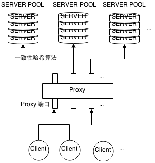 增加Proxy层,由Proxy实现一致性哈希算法(支持:KETAMA/取模/随机)