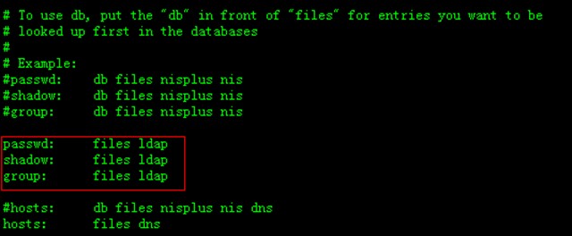 (3)修改客户端计算机中的/etc/nsswitch.conf文件,在passwd、shadow、group后面都加上ldap,如下图所示。