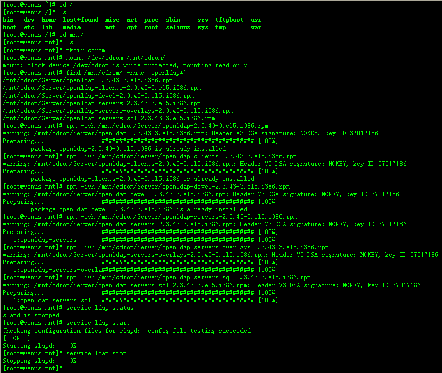 从以上测试可看出,OpenLDAP已经正确安装到系统中,接下来就需要修改配置文件,设置LDAP的根目录了。