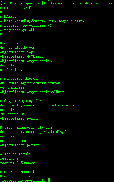 # ldapadd -x -D "cn=root,dc=dlw,dc=com" -w secret -f dlw.com.ldif