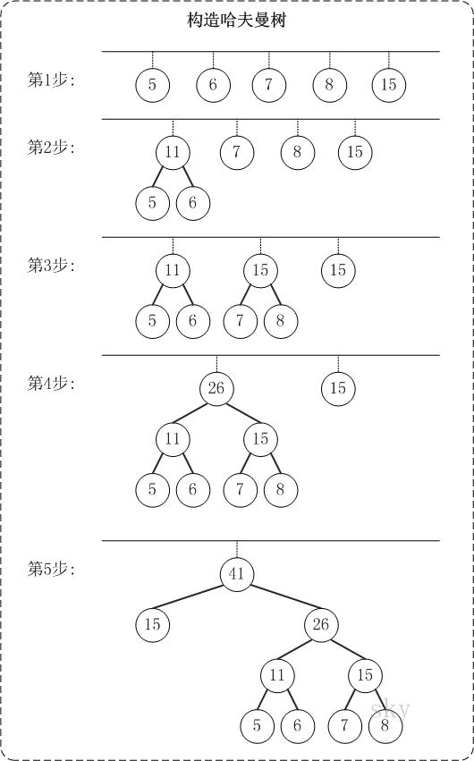 以{5,6,7,8,15}为例,来构造一棵哈夫曼树。