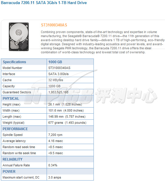 可以看出,新版和老版1TB酷鱼参数上变化最大的单碟容量并没有列出来。表格上可以看见的变化有三项:产品重量(从677克降低到630克)、随机写入寻道时间(小于9.5毫秒提升到小于10毫秒)、最大启动电流(3安降低到2.8安)。产品重量和启动电流的降低可以理解:老版本单碟容量250GB,因此具有4个碟片,新版本单碟容量334GB,因此只有3个碟片,相应地,重量和功耗也就降低了。