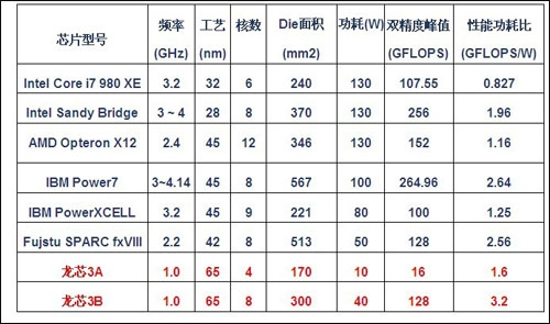 龙芯3号性能与功耗和同类产品对比表