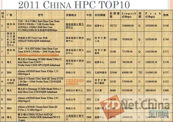 与去年相比,前十名中由国防科大研制、落户在国家超级计算天津中心的天河一号A继续保持第一的位置;由国家并行计算机工程技术研究中心研制,落户在国家超级计算济南中心的“神威蓝光”超算系统取代了去年曙光星云的位置排名第二。第三位也是国防科大研制,安装在国家超级计算长沙中心的天河一号A-HN。去年由曙光公司研制,落户国家超级计算深圳中心的曙光星云系统排名第四。第五名之后的情形与去年相仿,变化不大。以下是Top10的排名: