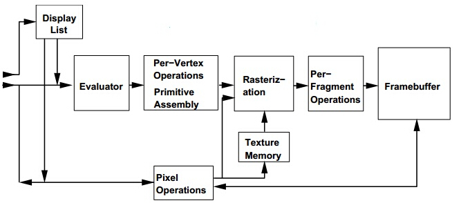 所谓绘制管线,就是OpenGL在绘制图像过程中所经过的操作步骤,主要有:求值器、逐顶点操作、图元装配、纹理贴图、光栅化、片元操作等等。这样的绘制管线称为固定绘制管线,因为一旦绘制开始,绘制过程人为无法干预。