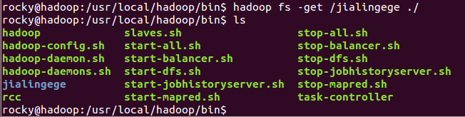例如使用以下命令是把HDFS中的根目录中的jialingege这个文件夹复制到本地,具体效果如下图所示:
