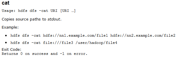 可以看出很多命令和Linux文件操作系统的命令是一样的,例如cat这个命令在Linux中的含义是将一个文件的内容在屏幕上打印出来,在Hadoop文件系统中的含义是一样的,需要注意的一点是在hadoop 1.1.2文档中文件系统操作命令有所改变,但是官方网站却没有相应的改变,例如我们看cat命令: