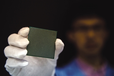 一名研发工程师展示“神威太湖之光”所使用的“申威26010”众核处理器。