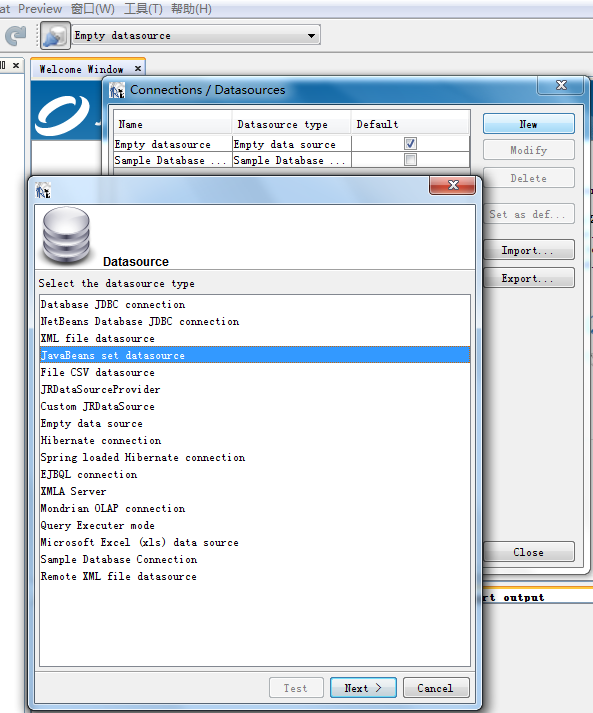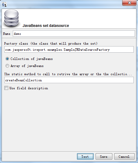 打开iReport,点击下图像插头一样的Report Datasources,弹出对象框中New,选择"JavaBeans set datasource"后Next,输入Name为"demo"后Save,如下两图: