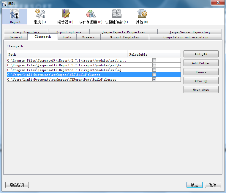 点击“工具”“选项”,选择classpath标签页,点击Add Folder,将项目类路径加入,如下图路径为:C:/Users/linli/Documents/workspace/JSReportDemo /build/classes