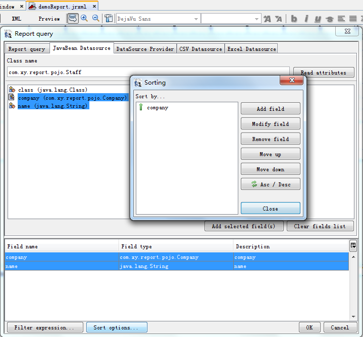 将左侧Report Inspector中Fields下刚加入的字段托到报表设计器中,取公司名写成$F{company}.getName(),公司地址为$F{company}.getAddress().getCity(),员工姓名为$F{name}。公司名和公司地址放在Group Header里,员工姓名放在Detail 1里。