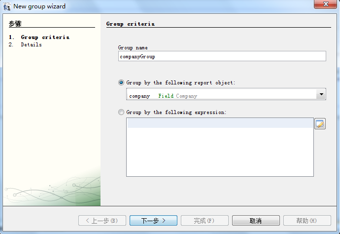 加击左侧Report Inspector中的demoReport,选择"Add Report Group",在弹出框中输入分组名,选择分组字段,如下图。下一步至完成。