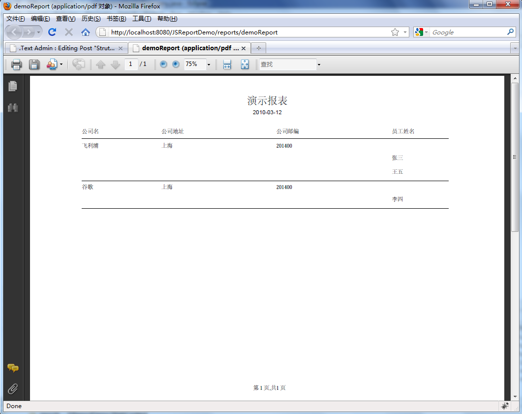 将编译好的demoReport.jasper文件复制到项目WebContent/reports目录下,启动容器,浏览器下查看报表如下: