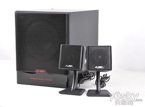 奋达F680多媒体音箱稍显方正的箱体设计突显硬朗的线条,常规的黑色没有花俏的色彩来得鲜艳,但更容易和周边的数码设备搭配。低音炮和卫星箱差异的体积看似不大协调,实际使用中我们往往习惯把卫星箱放置在桌面上,而把低音炮隐藏在桌子底下,因为低音没有指向性所以摆放位置相对自由,这样低音炮更大的体积可带来出色的低音效果。