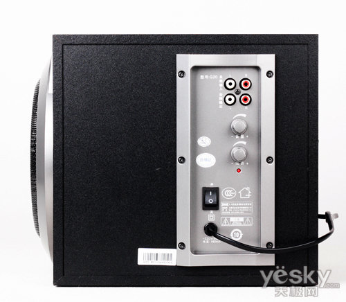 G20主箱上的音量调节、开关、接口均设置在侧边,较多数的主箱习惯把接线孔设在背后,调节控键背面或侧面,这种分布比较常见。