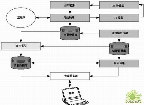 系统从“网页”中得到文本信息,送入“文本索引”模块建立索引,形成“索引”。同时进行“链接信息提取”,把链接信息(包括锚文本、链接本身等信息)送入“链接”,为“网页评级”提供依据。