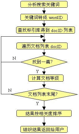 搜索的处理过程是对用户的搜索请求进行满足的过程,通过用户输入搜索关键字,搜索服务器对应关键词字典,把搜索关键词转化为wordID,然后在标引库中得到docID列表,对docID列表进行扫描和wordID的匹配,提取满足条件的网页,然后计算网页和关键词的相关度,根据相关度的数返回前K篇结果(不同的搜索引擎每页的搜索结果数不同)返回给用户。如果用户查看的第二页或者第多少页,重新进行搜索,把排序结果中在第K1到2*K的网页组织返回给用户。其处理流程如下图所示: