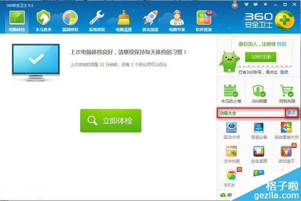 打开360安全卫士,在功能大全旁点击“更多”