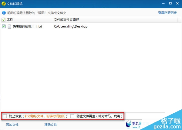 添加成功,可以在下方的两个“防止”中打上勾,然后点击“粉碎文件”
