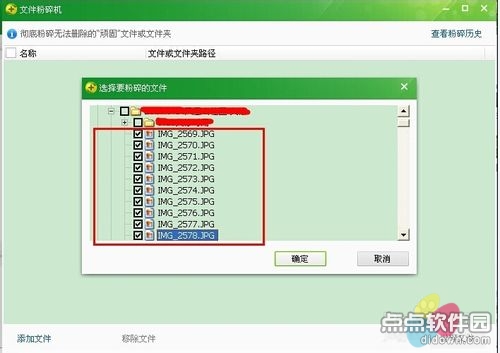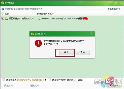 点击“粉碎文件”之后,“文件粉碎机”会出现提醒消息“文件将被彻底删除,确定要粉碎选定的文件(文件夹)吗?”,如确定无误,点击“确定”。