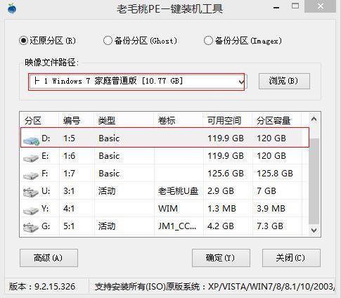 2、进入PE系统,在桃PE一键装机工具窗口,点击“浏览”将win7系统镜像添加进来,然后在磁盘列表中选择D盘作为系统盘,点击“确定”即可,如图所示: