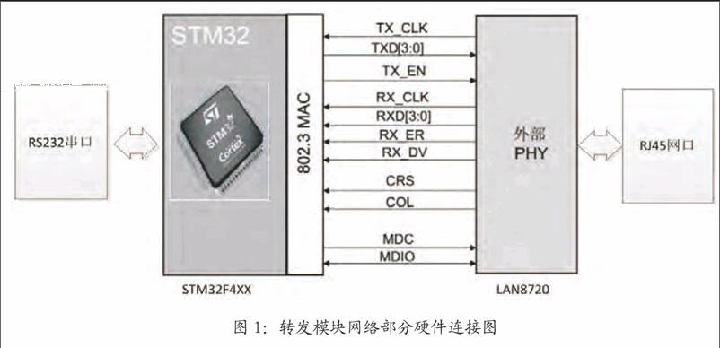 本文采用的设备是一种能够将RS232串口数据转成网络数据的转发模块,模块的单片机采用ARM架构的STM32F429芯片,STM32F429基于Cortex-M4架构,具有浮点运算单元,2MB容量的FLASH,256KB的RAM,系统时钟频率能达到180MHz,外设丰富,最主要的是它具有以太网MAC接口,通过外接PHY芯片可以实现网络通讯功能。该模块的PHY芯片采用的是LAN8720,LAN8720是低功耗的10/100M以太网PHY芯片,支持通过RMII接口与以太网MAC层通信,内置10/100M全双工传输模块,支持HP Auto-MDIX自动翻转功能。转发模块网络部分硬件连接图如图1所示。