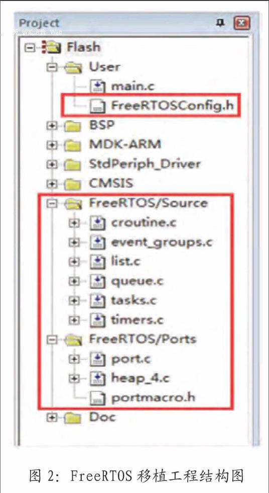 首先从官网下载FreeRTOS -8.2.3版本源码;然后在已有的工程模板(keil软件)上创建 FreeRTOS相关文件夹,添加源码文件到相应目录,添加后的工程目录如图2所示,红框内的文件就是添加的FreeRTOS源码,Source目录下主要是任务调度、消息队列、定时器等操作系统基本功能的实现,Ports目录下是操作系统与处理器平台架构相关的接口文件,Port.c是支持Cortex-M4架构的,Heap_4.c是一种动态内存使用方法。