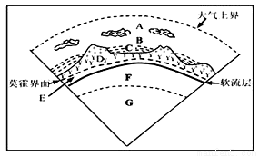 B.地球内部圈层由E、F、G三部分组成,其中G为地核